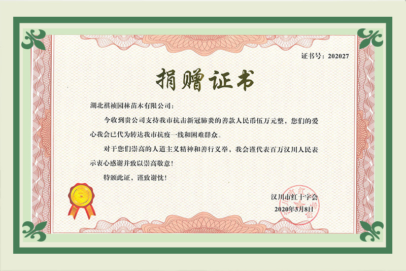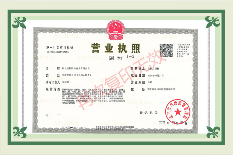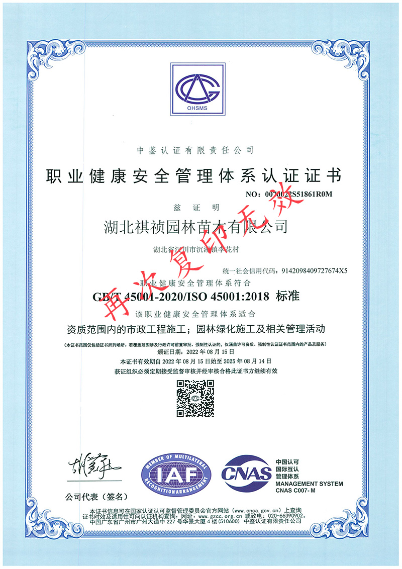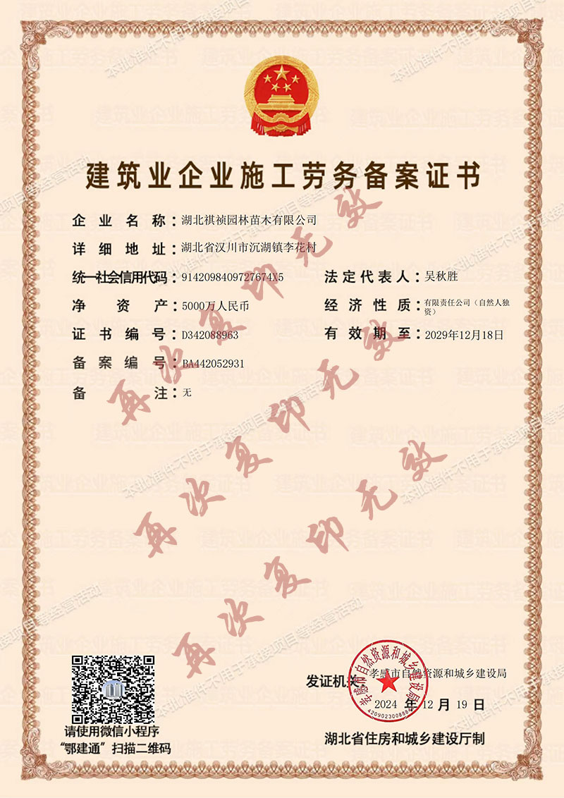 湖北祺禎園林苗木有限公司是一家專門致力于發展現代林業、苗圃花卉、旅游觀光、休閑娛樂、園林市政環保工程建設于一體的湖北省林業產業化省級龍頭企業,公司具備城市園林綠化、建筑工程施工總承包、市政公用工程施工總承包、機電工程施工總承包、城市及道路照明工程專業承包、環保工程專業承包、施工勞務資質不分等級等多項建筑業企業資質,先后獲得湖北省林業產業化省級重點龍頭企業、AAA級信用等級企業、孝感市“守合同重信用榮譽證書”、“五一勞動獎”等榮譽及質量管理、環境管理、職業健康安全管理三大體系認證。